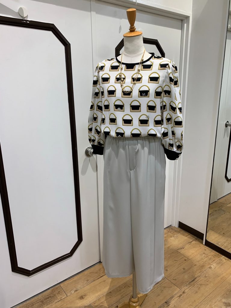 そこで、ちょっと個性的なバック柄のブラウスを選び、それに合わせて、とろみ感のあるワイドパンツでエレガントなドラマティックスタイルに仕上げました。